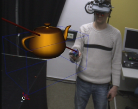 Mixed Reality, is a symbiosis of spaces which are synchronized with respect to human perception. One space corresponds to the usual environment of humans, the other is virtual and exists digital. It contains information, which is mostly visualized in form of objects for the receipients perception, conditioned by the mixed reality technology. The virtual tea pot in the image is essentially visible through the display of te receipient and is moved through space by the hand pointer here. (the MR scene was especially rendered for the observing camera) Mixed Reality, die gemischte Realität, ist eine Symbiose von Räumen, die im Sinne der menschlichen Wahrnehmung synchronisiert werden. Der eine Raum entspricht dabei der gewohnten Umgebung der Menschen, der andere ist virtuell und existiert digital. Er enthält Information, die meist in Form von Objekten visualisiert und für die Wahrnehmung des Rezipienten durch die Technologie der Mixed Reality aufbereitet wird. Die virtuelle Teekanne in der Abbildung ist tatsächlich nur durch das Display des Rezipienten zu sehen und wird hier mit dem Handpointer durch den Raum bewegt. (die MR Szene wurde speziell für die beobachtende Kamera gerendert) The definition and evolving meaning of MR formerly known as Mixed Reality [1] adressing the reality continuum and essentially focusing on enabling technology, is expanding to Mixing Realities [2] which in addition means an ongoing process of human collaboration where individuals experience and express realities, mediated by technology and their collaborators. Die Definition und die sich entwickelnde Bedeutung von MR ist seit einiger Zeit bekannt als Mixed Reality [1] (gemischte Realität) welche das Realitätskontinuum adressiert und sich auf technische Voraussetzungen konzentriert, weitet sich aus auf Mixing Realities [2] (sich mischende Realitäten) damit ist zusätzlich der fortlaufende Prozess von menschlicher Kollaboration gemeint, in dem Individuen Realitäten erfahren und ausdrücken die durch die Technologie und die Mitwirkenden vermittelt wird. |